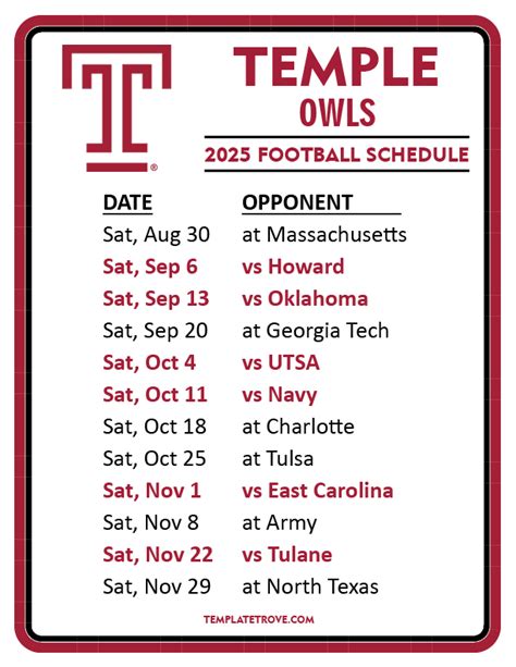 If you’re planning to attend any of the Temple Owls games this season, it’s essential to have a schedule guide. Here’s a breakdown of the game dates, times, and locations: